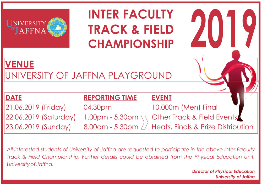 The Annual Inter Faculty Track & Field Championship – 2019 will be held on 22nd & 23rd of June 2019 (Saturday & Sunday) from 1.00pm to 5.30pm and 8.00am to 5.30pm respectively as per the following schedule: