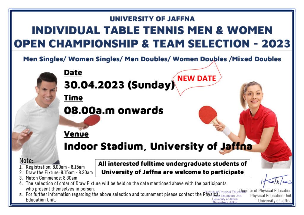 The University of Jaffna Individual Table Tennis (Men & Women) Open Championship and Team Selection – 2023 will be held on 30th April 2023 (Sunday) from 8.00am onwards at Indoor Stadium, University of Jaffna.